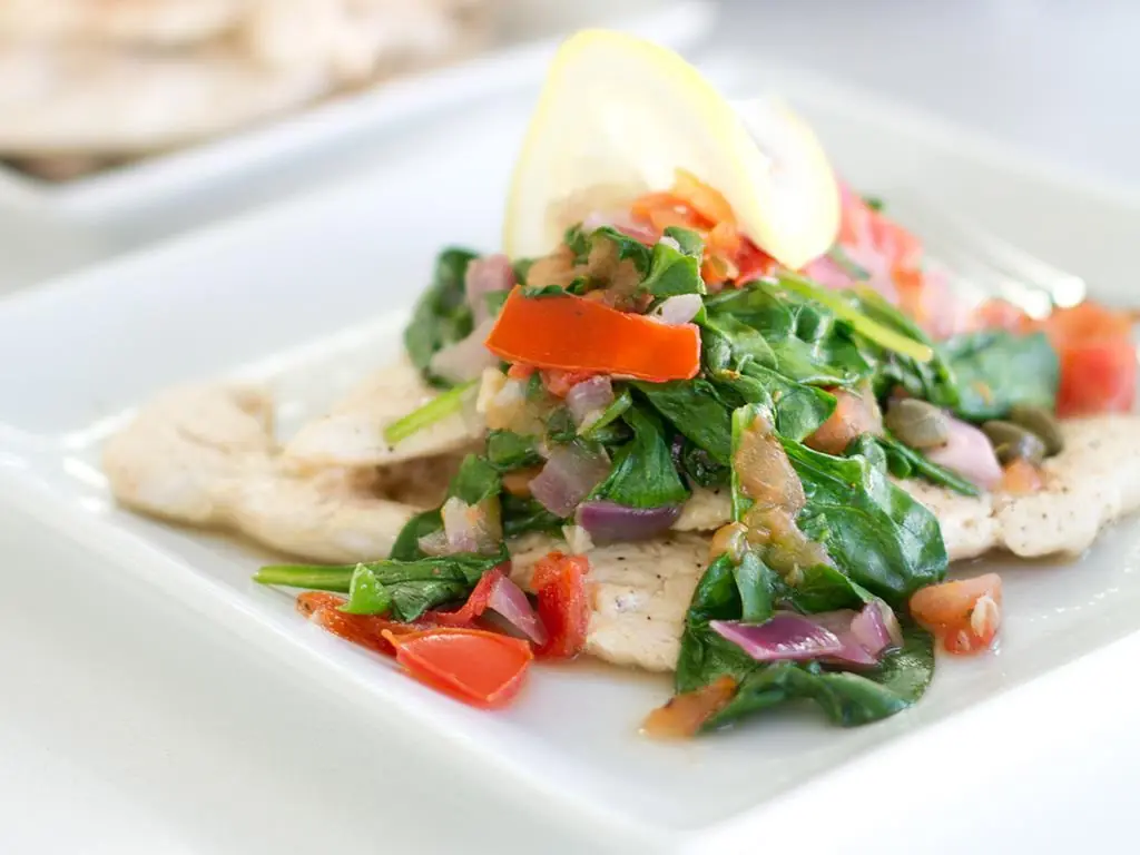To serve, plate chicken, top with the tomato/spinach medley, and garnish with a wedge of lemon.