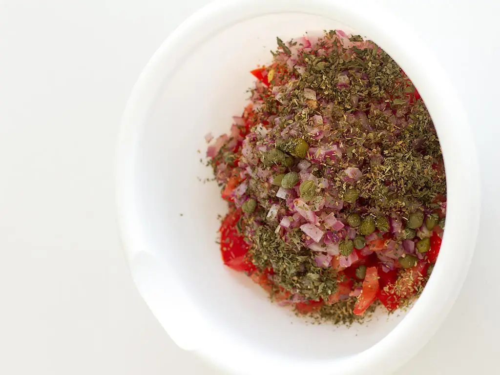Place sautéed onion and garlic in a bowl and add the tomato, juice from Lemon (1), Capers (1 Tbsp), Fresh Parsley (1 tsp), Fresh Basil (1 tsp), and Dried Oregano (1/2 tsp), Salt (to taste), and Ground Black Pepper (to taste). Set aside.