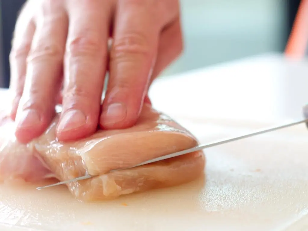 Halve each Chicken Breasts (4 pieces) horizontally, cutting them parallel to the counter.