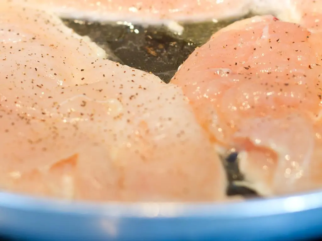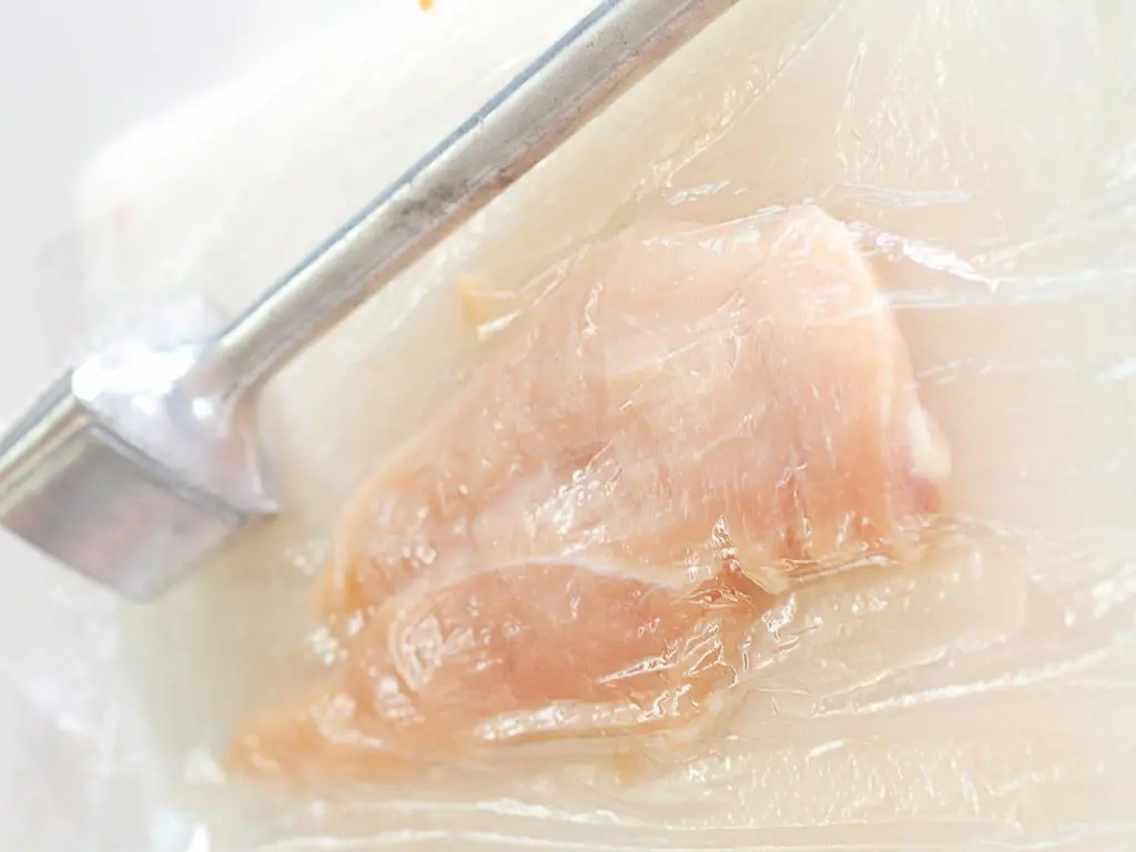 Cover the chicken with saran wrap and lightly pound each cutlet with a meat mallet until about 1/4 inch thick. In a pinch, you could also use a skillet or rolling pin. Season to taste with salt and pepper.