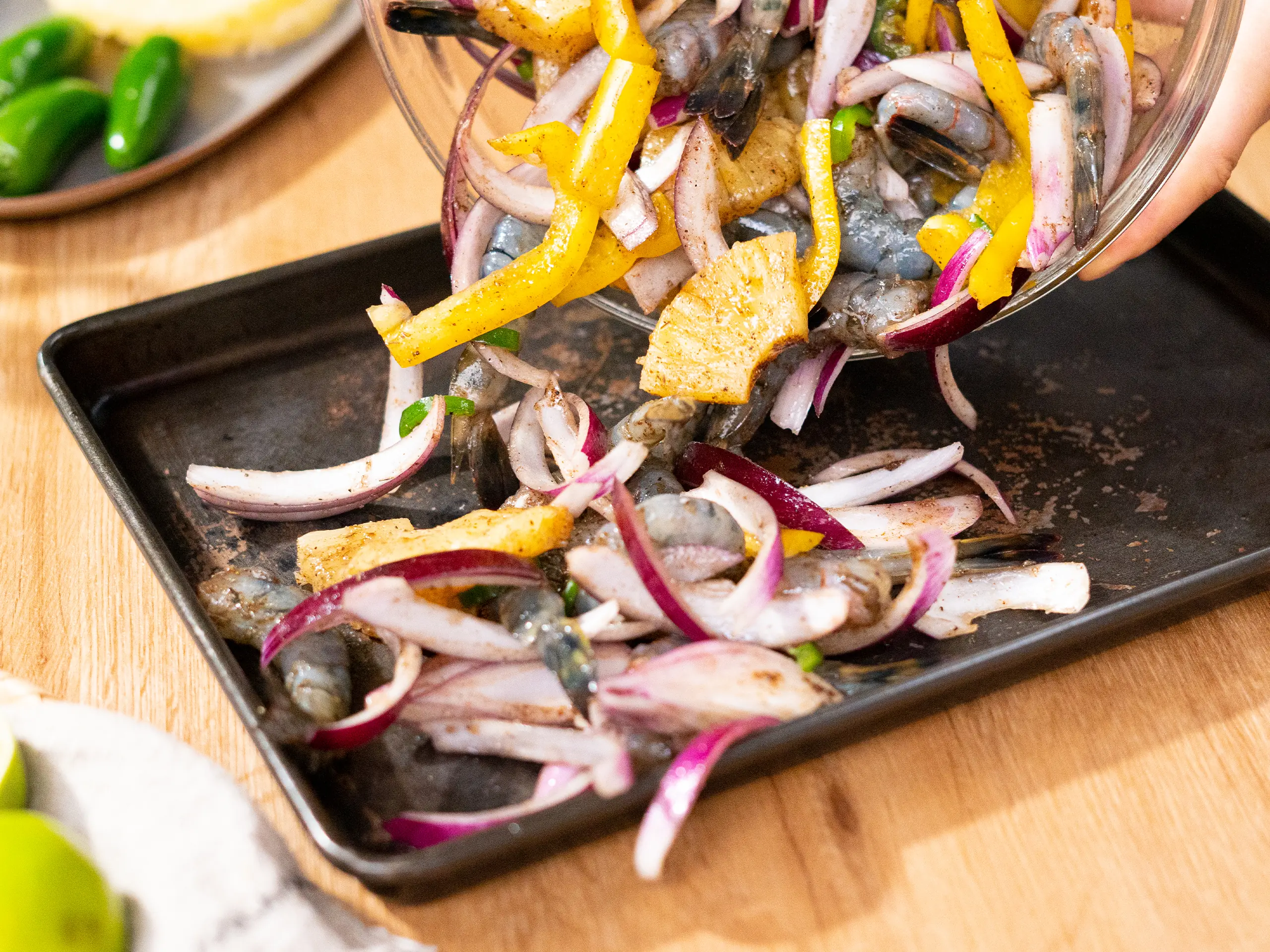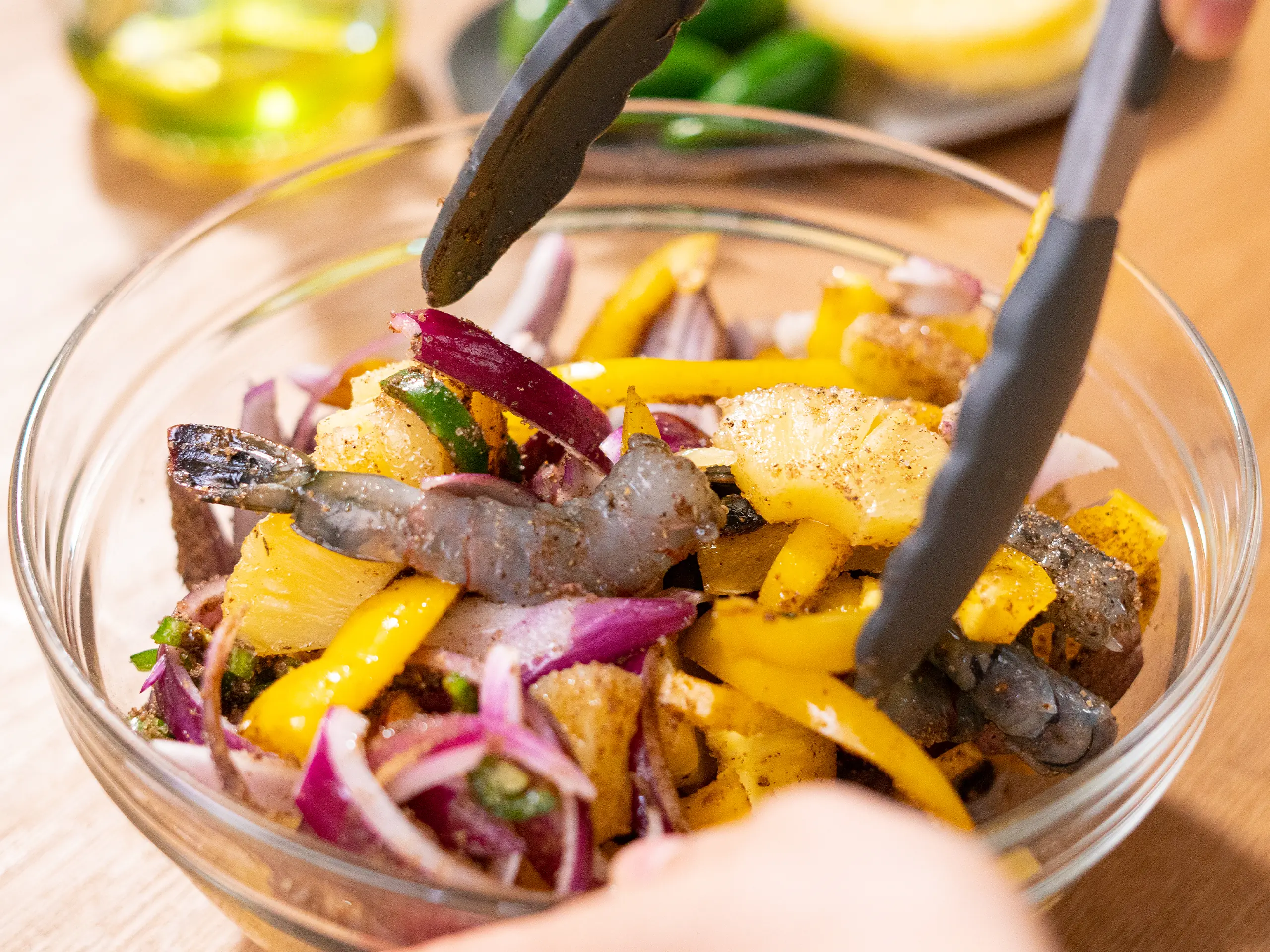 In a large mixing bowl, toss together the Large Shrimp (1 lb), Yellow Bell Pepper (1), Pineapple (1 can), Jalapeño Pepper (1), and Red Onion (1/2) with Olive Oil (1 Tbsp), Jerk Seasoning (2 Tbsp), Lime (1/4) and Brown Sugar (1 tsp).