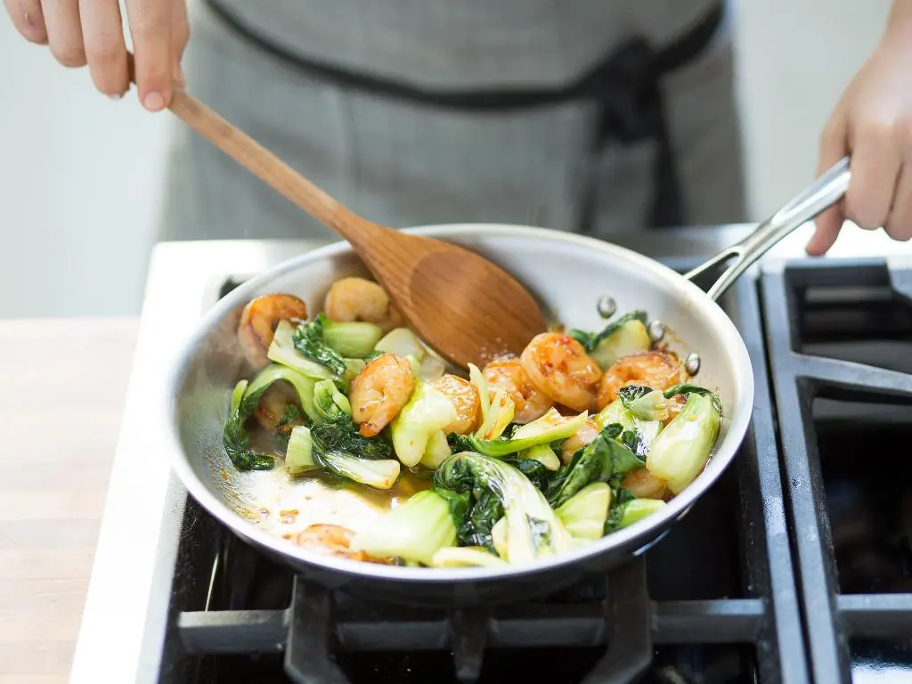 Add the baby bok choy and shrimp to the pan with Vegetable Oil (1 Tbsp) and continue to cook while moving the pan around for another 1 to 2 minutes, until the shrimp is cooked through and the baby bok choy is tender but still crunchy.