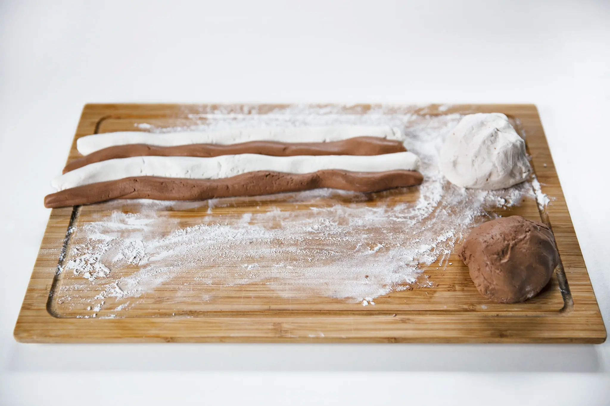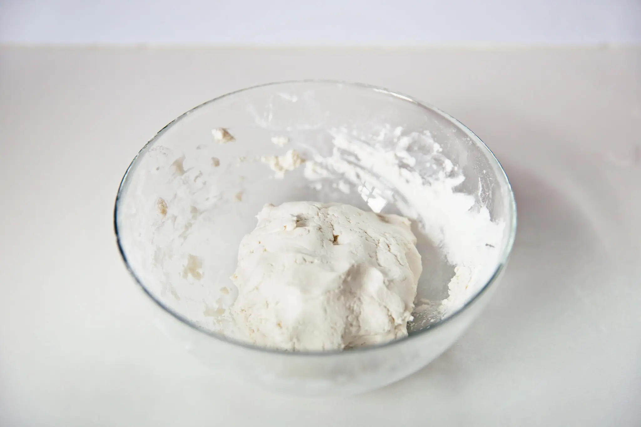 Mix both bowls separately until combined. Knead the dough to form two rounds.