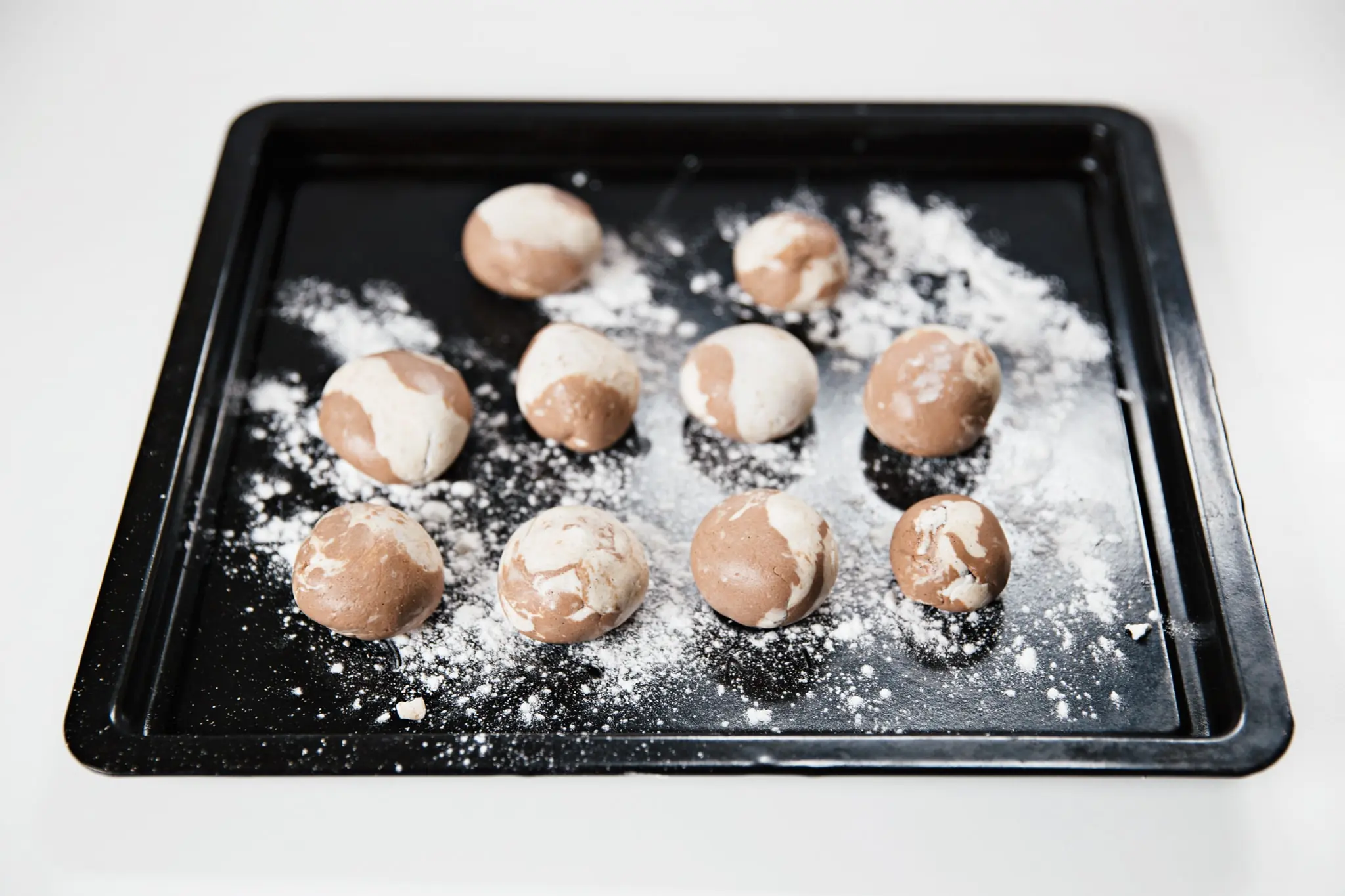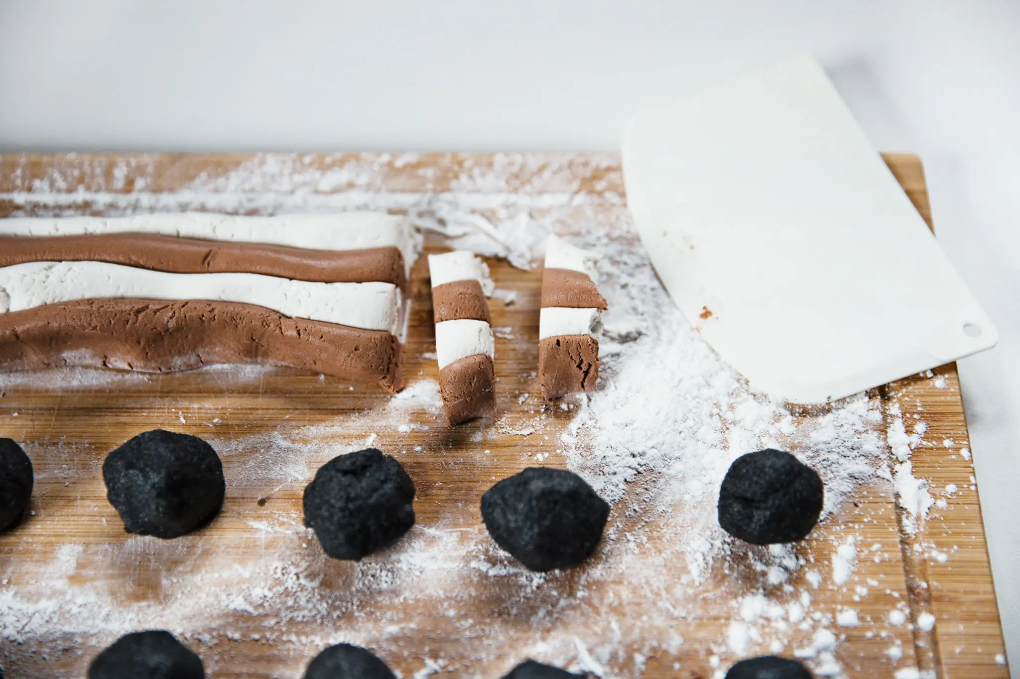 Wrap each sesame seed ball with two-tone "wrapper" and set aside.