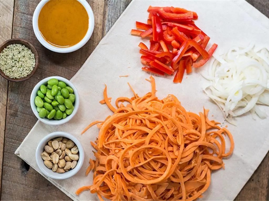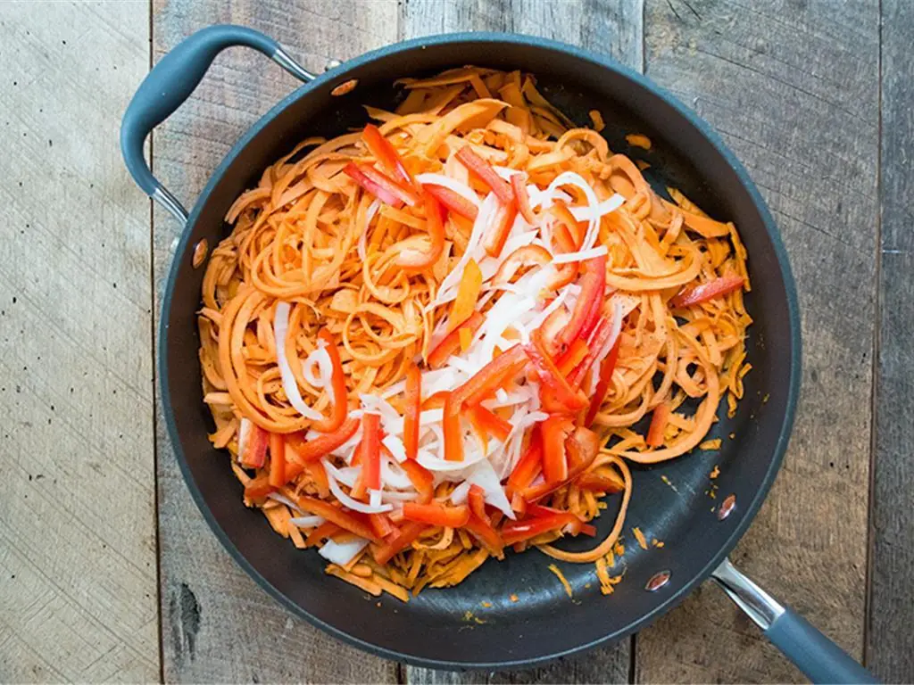 Use a spiralizer to make long strips out of the Sweet Potatoes (2).
