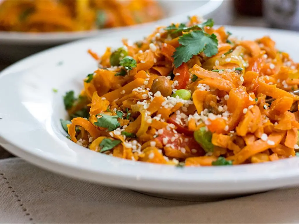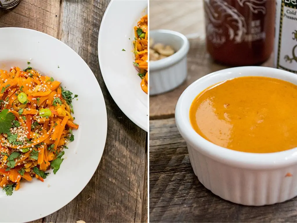 This Sweet Potato Pad Thai with Sriracha Sauce is the perfect dish to curb your Thai cravings, without the guilt! Vegetarian, Gluten Free, and Dairy Free!