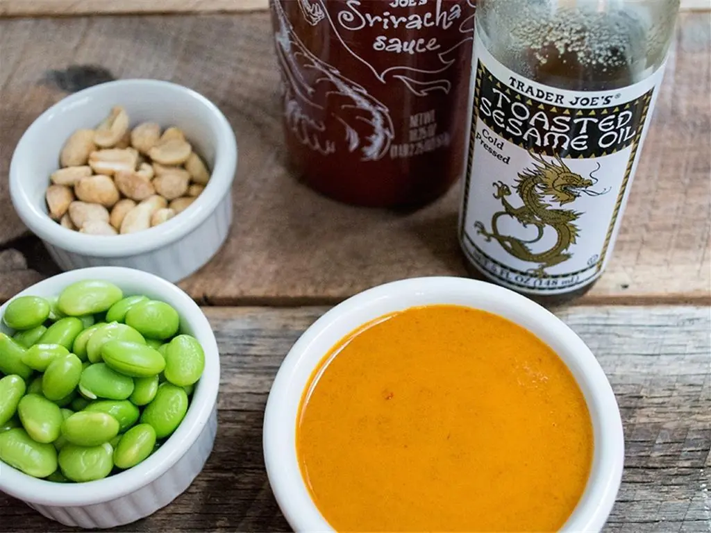 Meanwhile, combine the Peanut Butter (2 Tbsp), Sriracha (2 Tbsp), Almond Milk (2 Tbsp), Toasted Sesame Oil (1 tsp), Apple Cider Vinegar (1/2 tsp), Maple Syrup (1 tsp), and Ground Turmeric (1/2 tsp) in a bowl. Whisk until smooth.