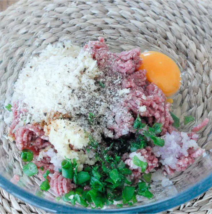 Mix Ground Beef (10.5 oz), Eggland's Best Classic Egg (1), Breadcrumbs (2/3 cup), Garlic (1 Tbsp), Fresh Ginger (1 tsp), and Scallions (to taste) in a big bowl, season with Salt (to taste) and Ground Black Pepper (to taste).