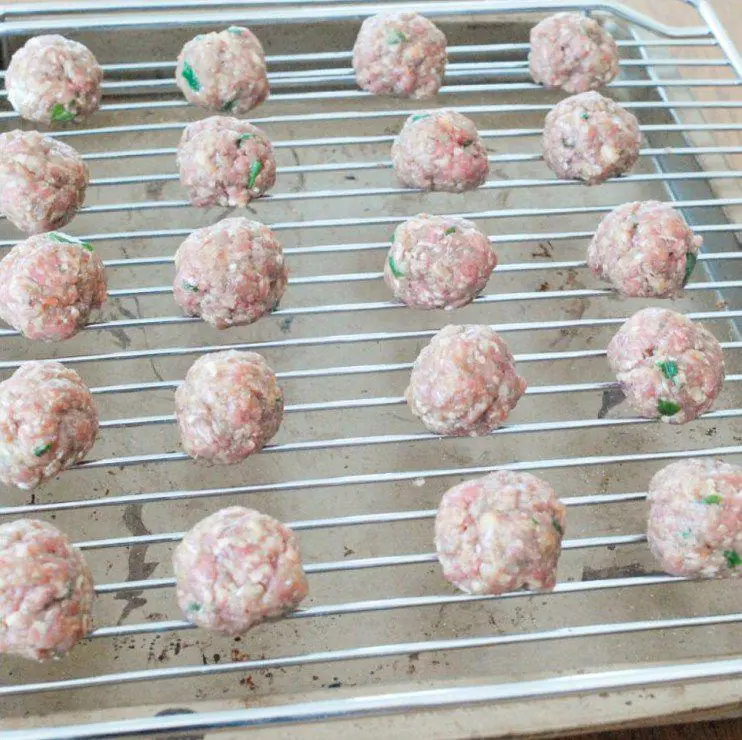 Take out a small portion of meat, roll into balls then place on the rack on top of a baking tray.