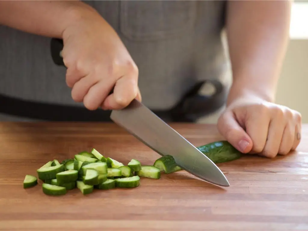 Heat grill to high. Peel and finely chop the Fresh Ginger (2 1/3 Tbsp), Fresh Basil (1/2 cup), Fresh Mint (1/3 cup), and Fresh Cilantro (1/2 cup). Slice Red Bell Pepper (1/2) into strips. Cut Mini Cucumber (1) into 1/2 inch half moons.