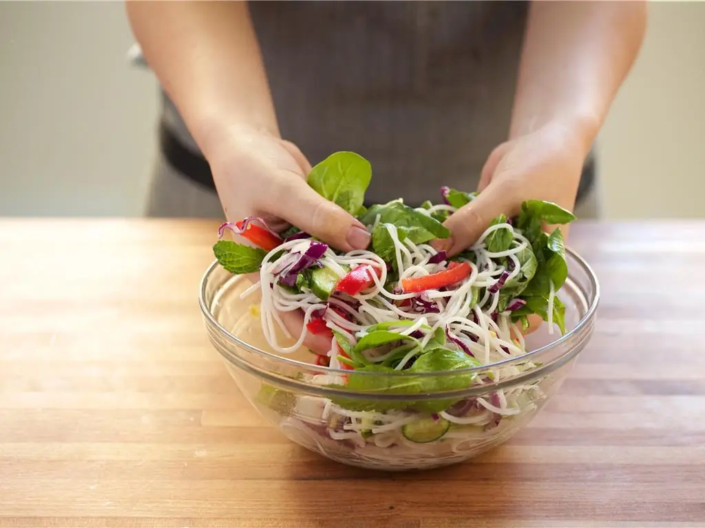 In the bowl with the noodles, add Arugula (2 3/4 cups), Red Cabbage (2/3 cup), Basil, Cilantro, Mint, Red Pepper, mini cucumber, and remaining dressing. Toss to combine.