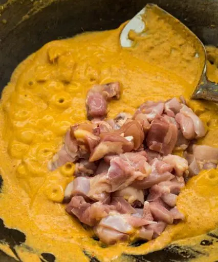 Add Boneless, Skinless Chicken Thighs (1 1/2 cups) to the curry, then allow the curry to simmer for about 5 more minutes over medium heat until the chicken is fully cooked.
