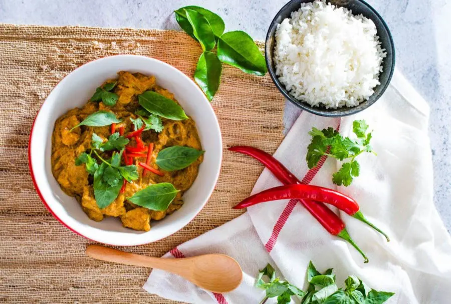 This hearty Thai Red Curry Chicken features a thick luscious sauce loaded with incredible flavor! Tender chicken is paired with buttery pumpkin, then topped with fresh cilantro leaves and Thai basil.