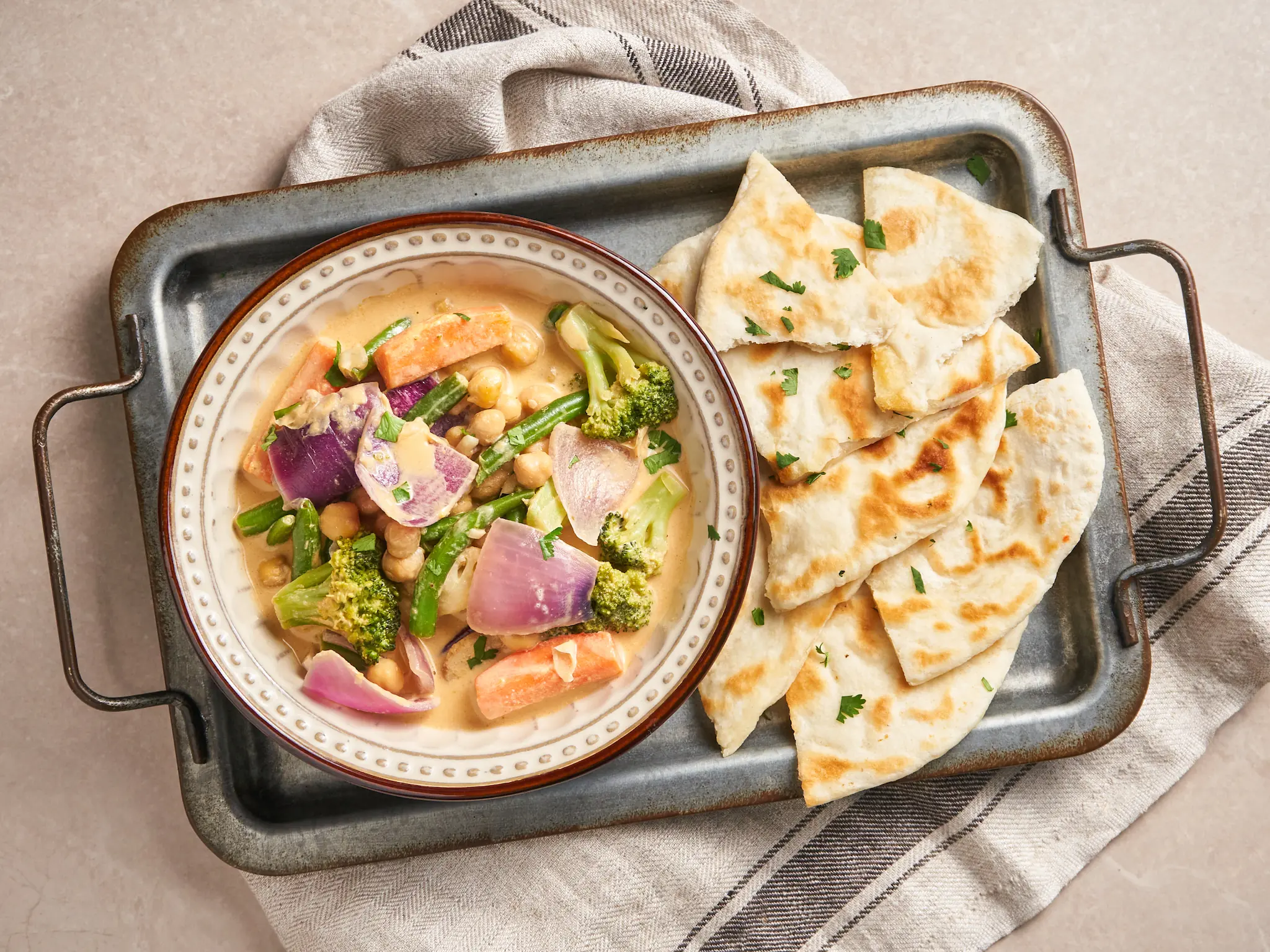 Remove from heat and stir in the juice of a Lime (1). Garnish with Fresh Cilantro Leaves (to taste) (optional) and serve with Naans (4) if desired.