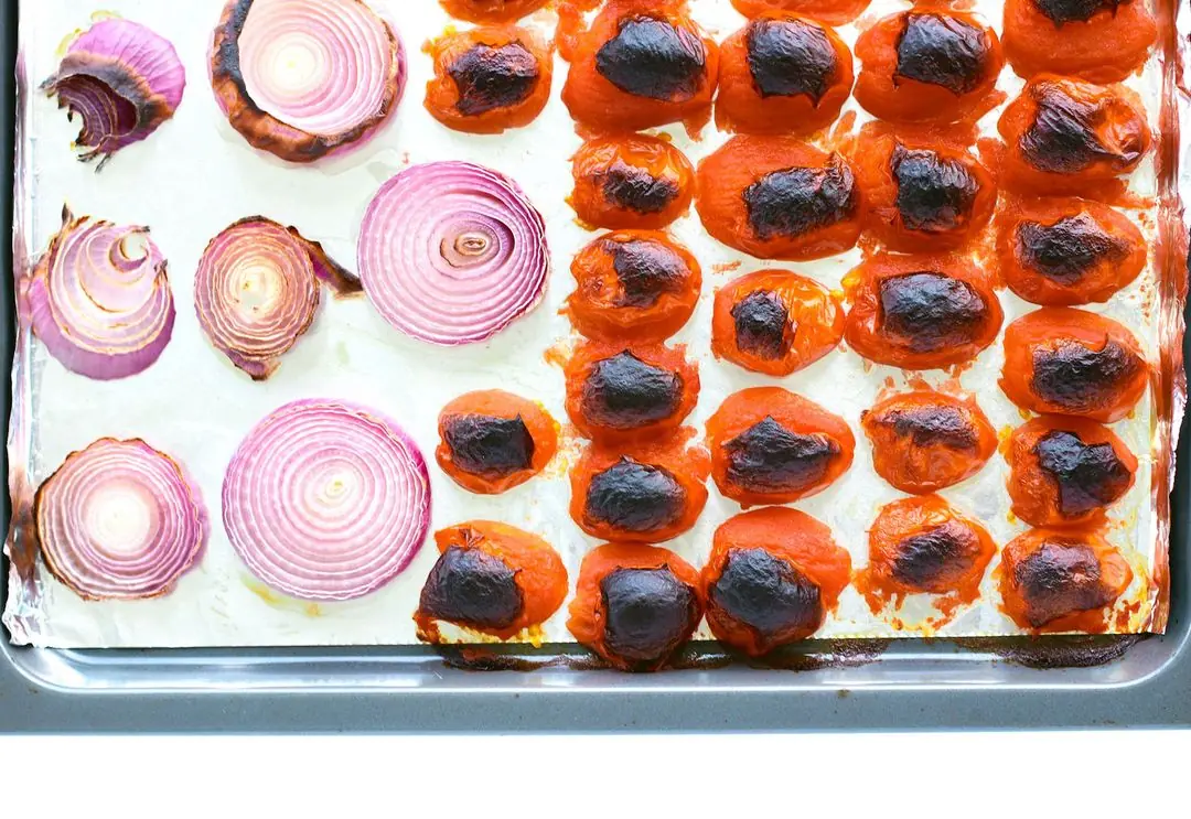 After about 5 minutes or once the chilies have blackened slightly, open the oven door, slide out the baking tray and use tongs to remove the chilies and set them aside. Slide the tray back in the oven and close the oven door to let the onions and tomatoes continue broiling/grilling for 10 minutes or until the skin of the tomatoes have blackened significantly and the onion slices have charred. Remove the baking tray from the oven and allow the tomatoes and onions to cool for 5-10 minutes.