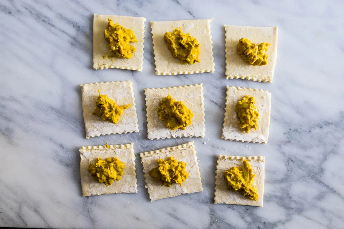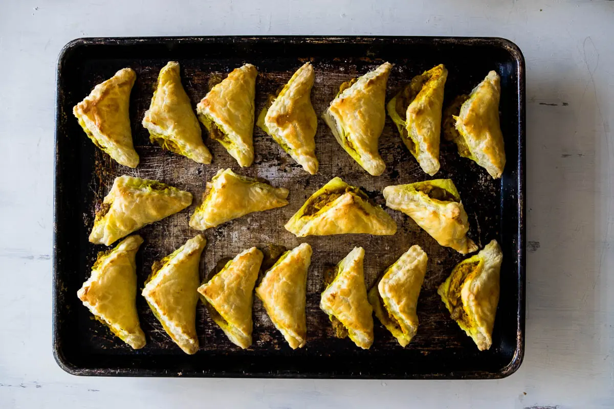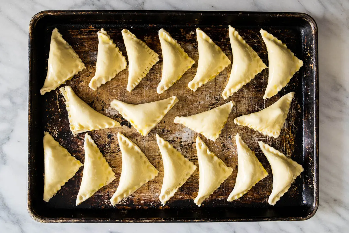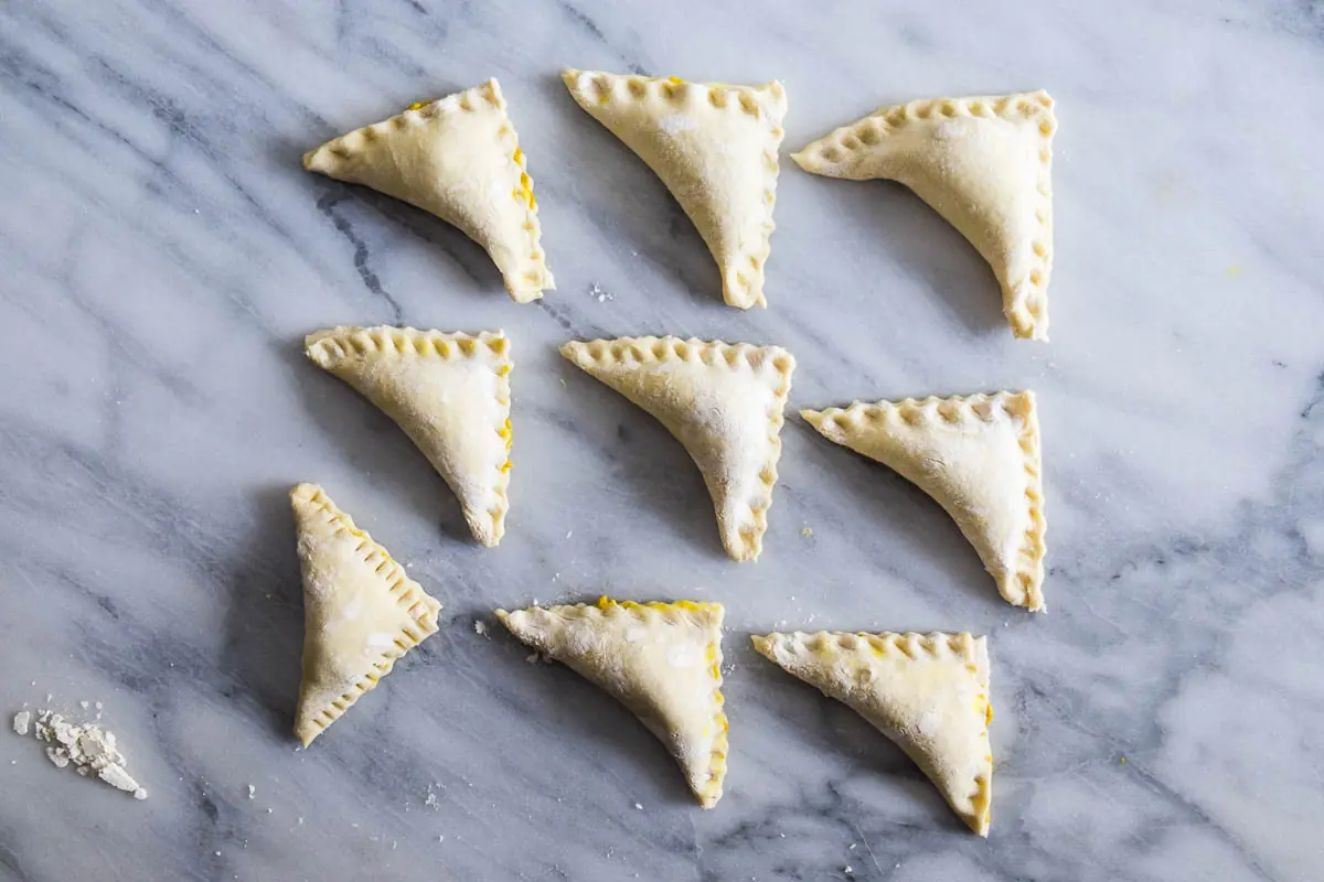 Place about 2 to 3 tablespoons of the filling in the center of each square, then fold diagonally to form a triangle.