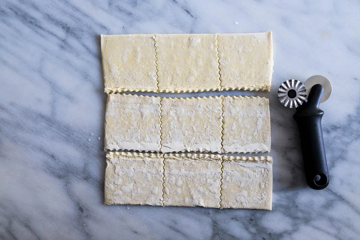 Unfold the Puff Pastry (1). Cut the sheet into 9 squares.