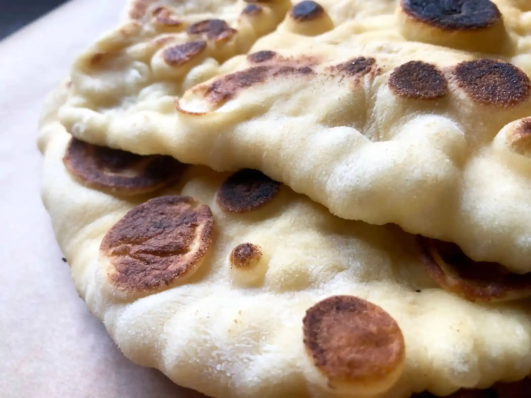 Flip the naan and cook, uncovered for another minute or so until multiple toasted spots appear on the underside. As you work, keep the stack of cooked naan wrapped in a linen towel.