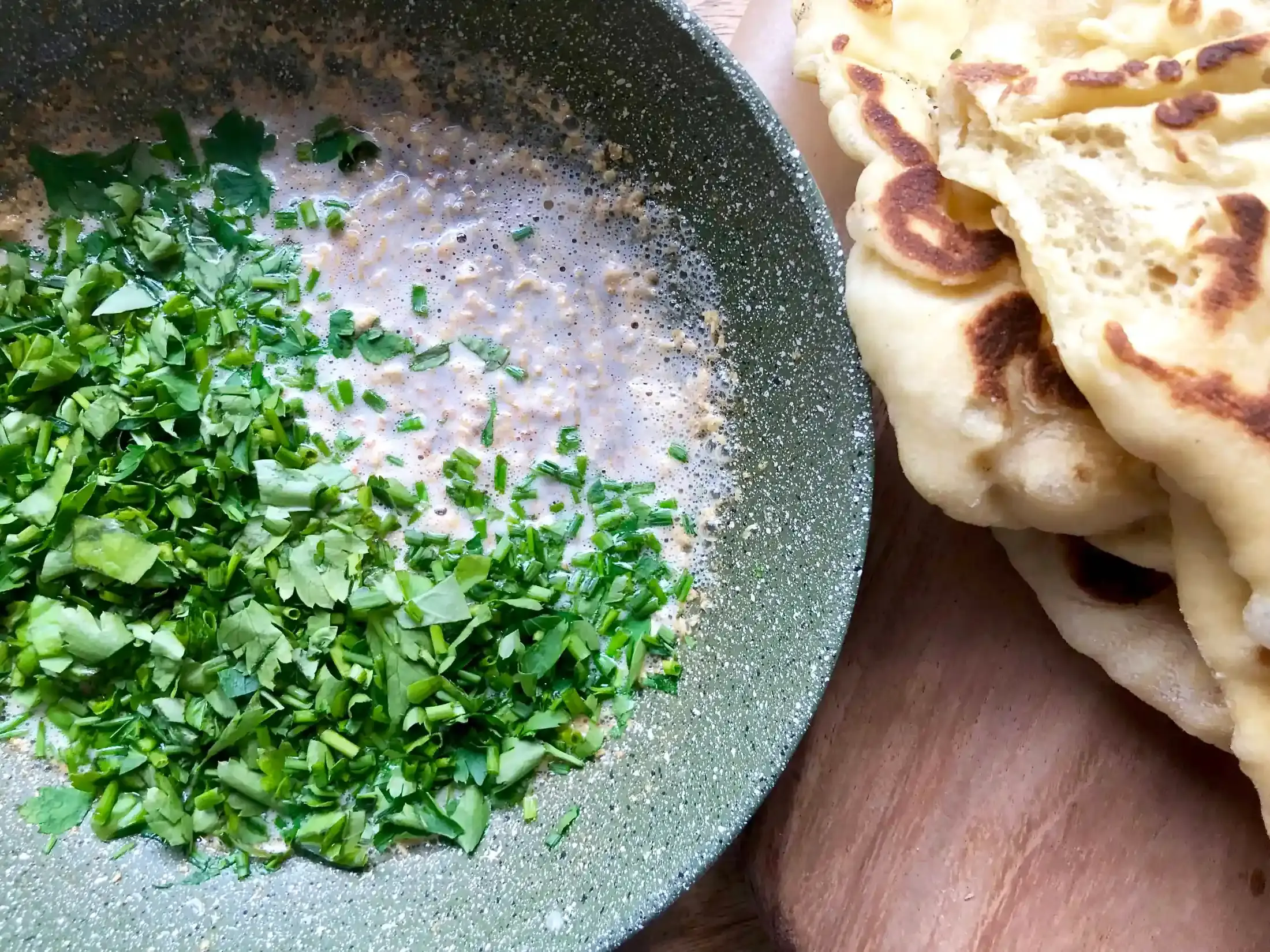 Remove from the heat and add the Fresh Herbs (3/4 cup). Brush the garlic herb butter over the warm naan and serve.