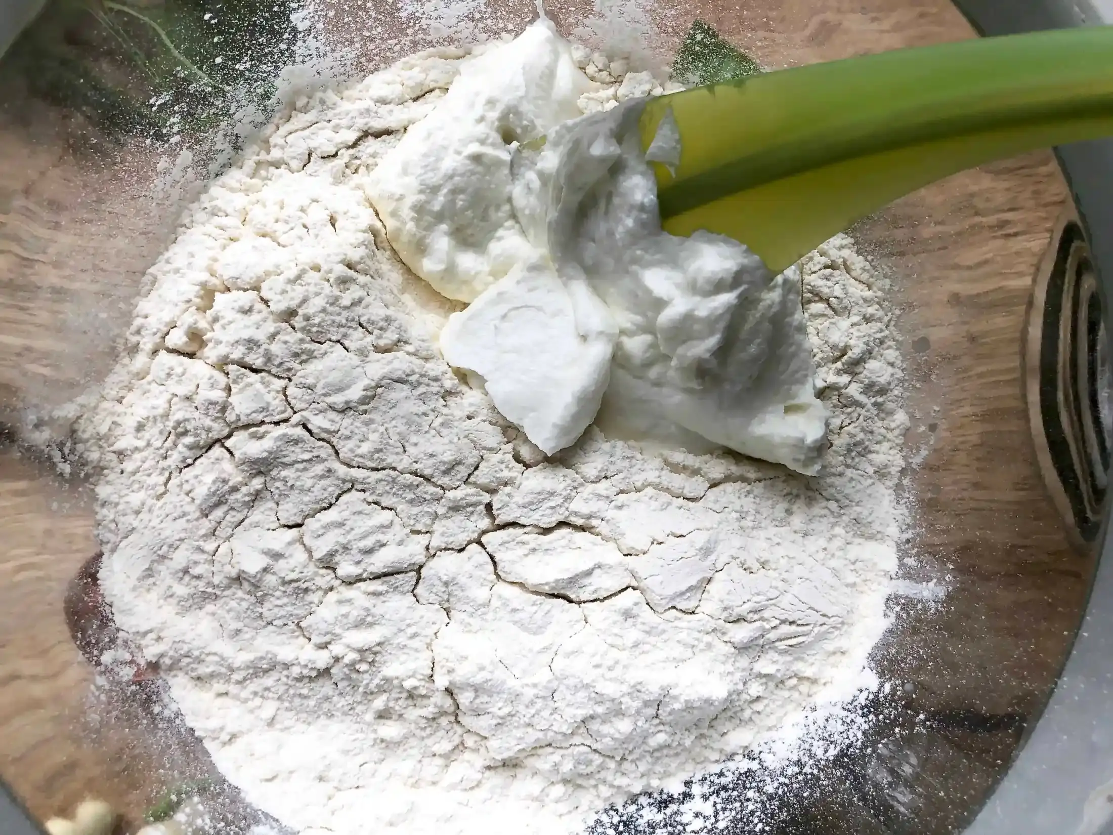 Add the flour mixture, Whole Milk (3/4 cup), and Plain Greek Yogurt (1 cup) to the mixer bowl containing the yeast mixture.