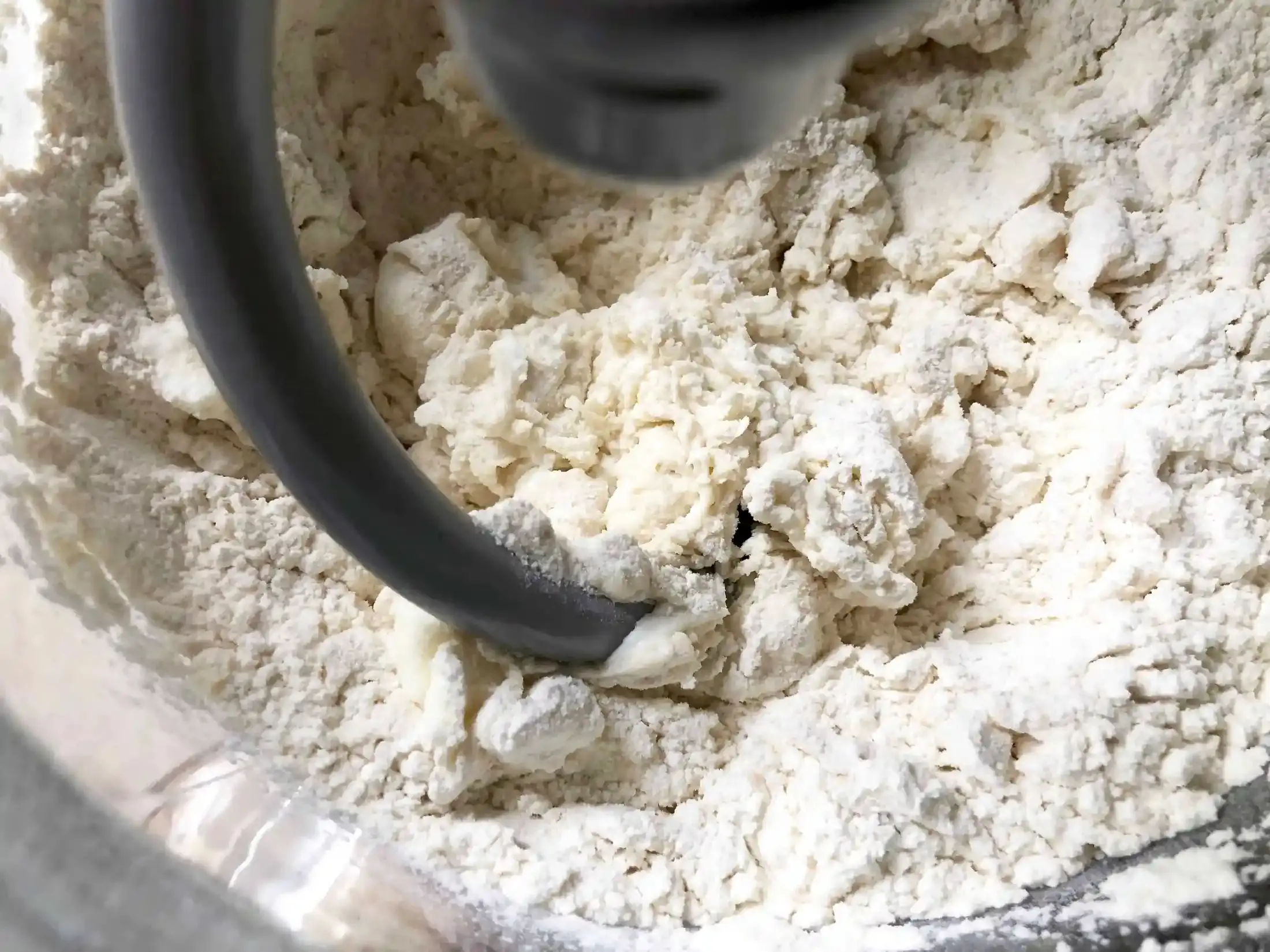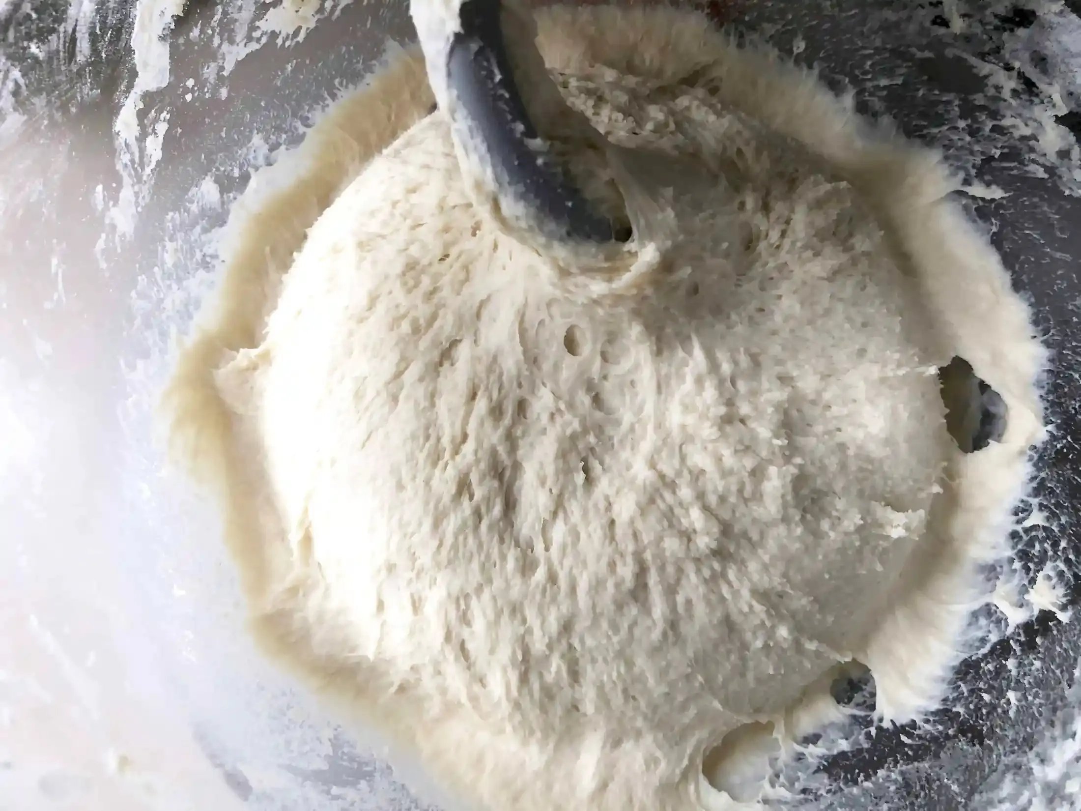Using the dough hook, mix until the flour is completely incorporated, about 4 minutes. The dough should be very sticky. Dust lightly with flour and remove from the bowl.