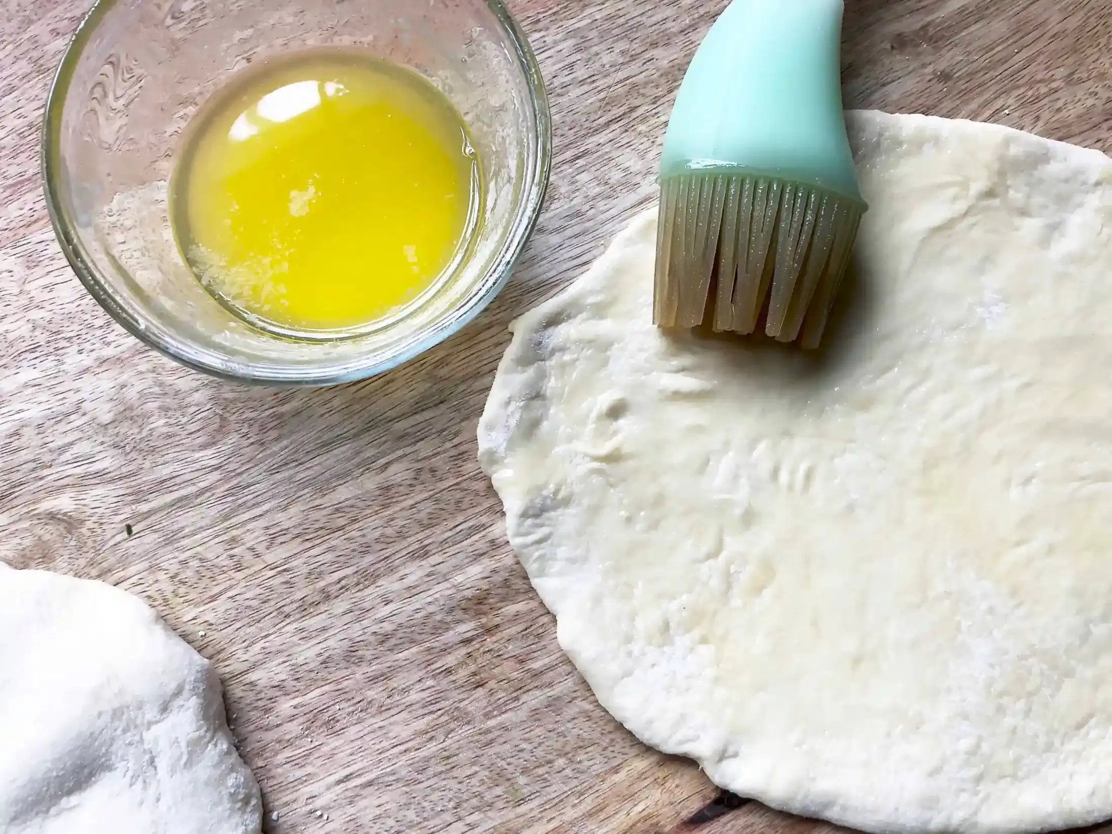 Melt Salted Butter (4 Tbsp). Lightly brush both sides of each dough oval with the melted butter as you proceed.