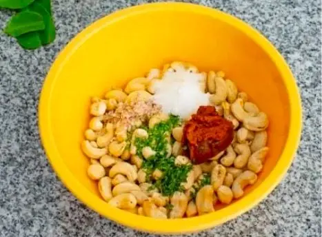 When the cashew nuts have cooled completely, top with Kaffir Lime Leaf (1). Serve and enjoy!