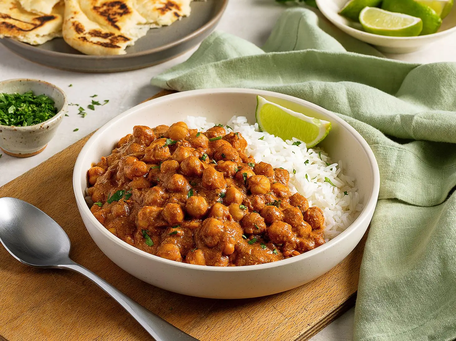 Stir in GOYA® Chick Peas (3 cans) and simmer, stirring occasionally, for an additional 15 minutes. Discard cinnamon stick. Season butter chickpeas with Adobo, to taste. Garnish with Fresh Cilantro (4 Tbsp). Serve with Jasmine Rice (4 cups), Naans (4), and Lime (1) wedges.