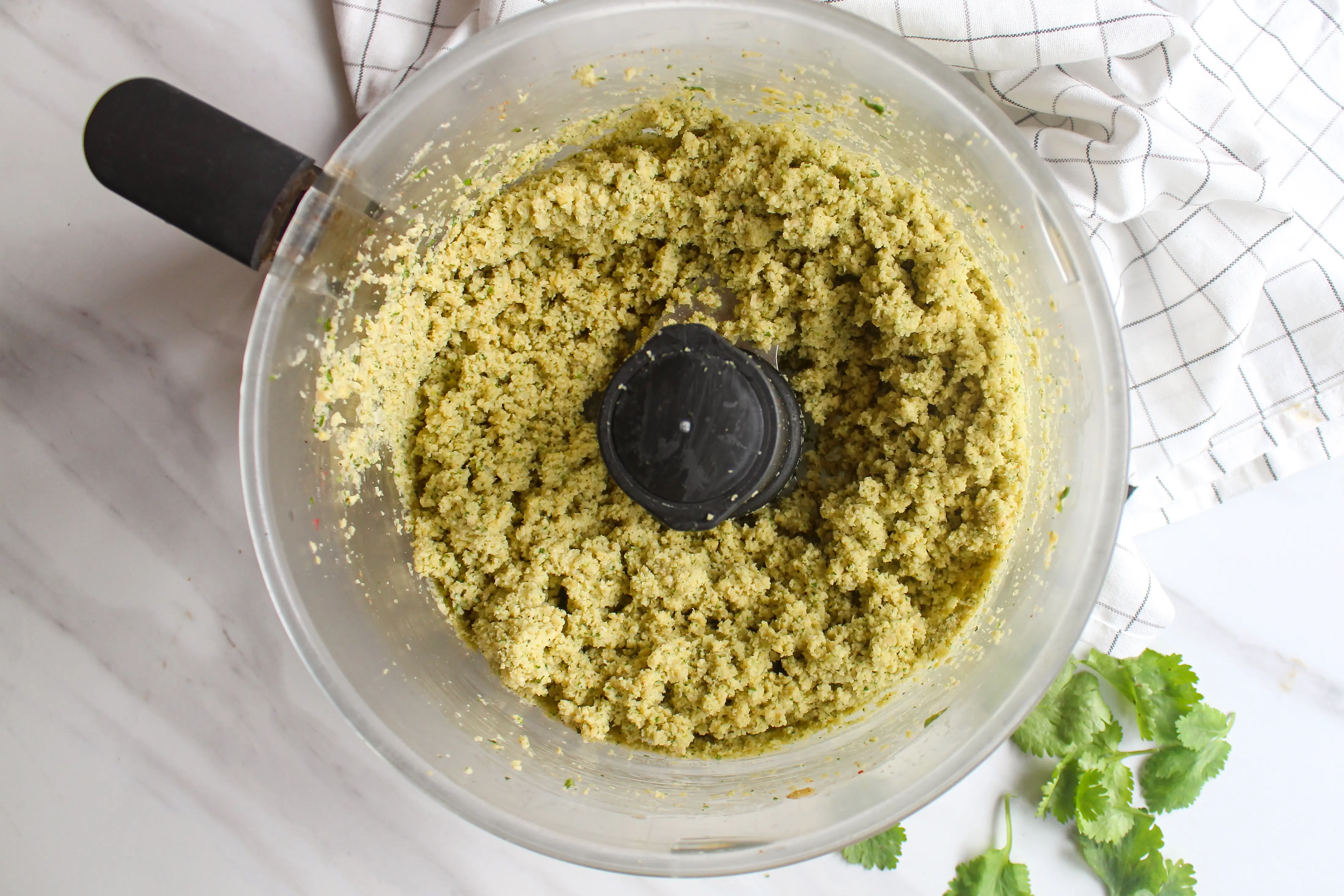 Place soaked Chickpeas, Scallion (1 stalk), Fresh Cilantro (1/2 cup), Fresh Parsley (1/2 cup), Garlic (3 cloves), Olive Oil (1 Tbsp), Chickpea Flour (2 Tbsp), Baking Powder (1 tsp), juice from Lemon (1), Chili Powder (1/2 tsp), and Salt (to taste) in a high-speed blender or food processor. Pulse until a crumbly dough forms.