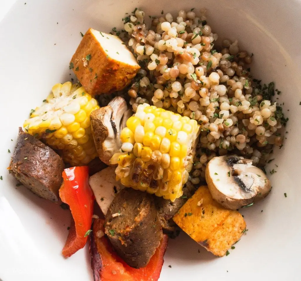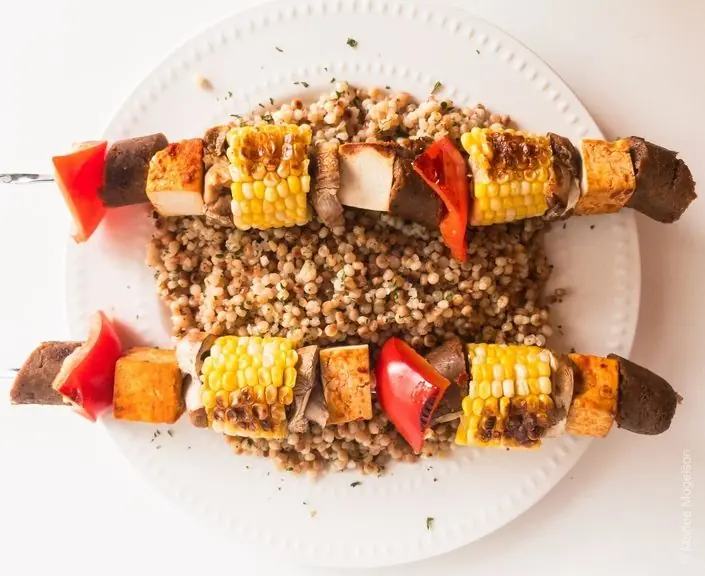 Several vegan favorites, all cooked on a stick and served on a bed of Israeli Couscous– a summertime fave.