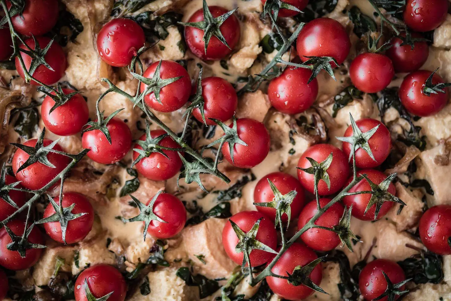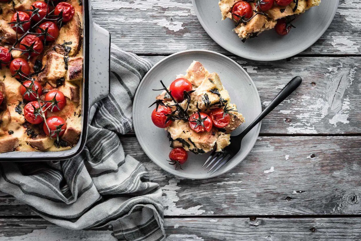 Brush Cherry Tomatoes (3 cups) with Olive Oil (as needed). Place them on top of strata.