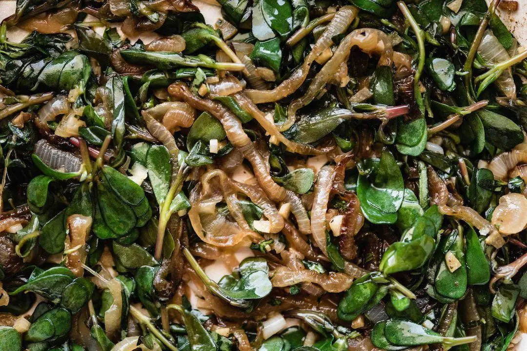 Once onions are nicely caramelized, add the Purslane (4 cups) and Garlic (4 cloves). Cook until purslane is tender and garlic is fragrant, about 3-5 minutes.