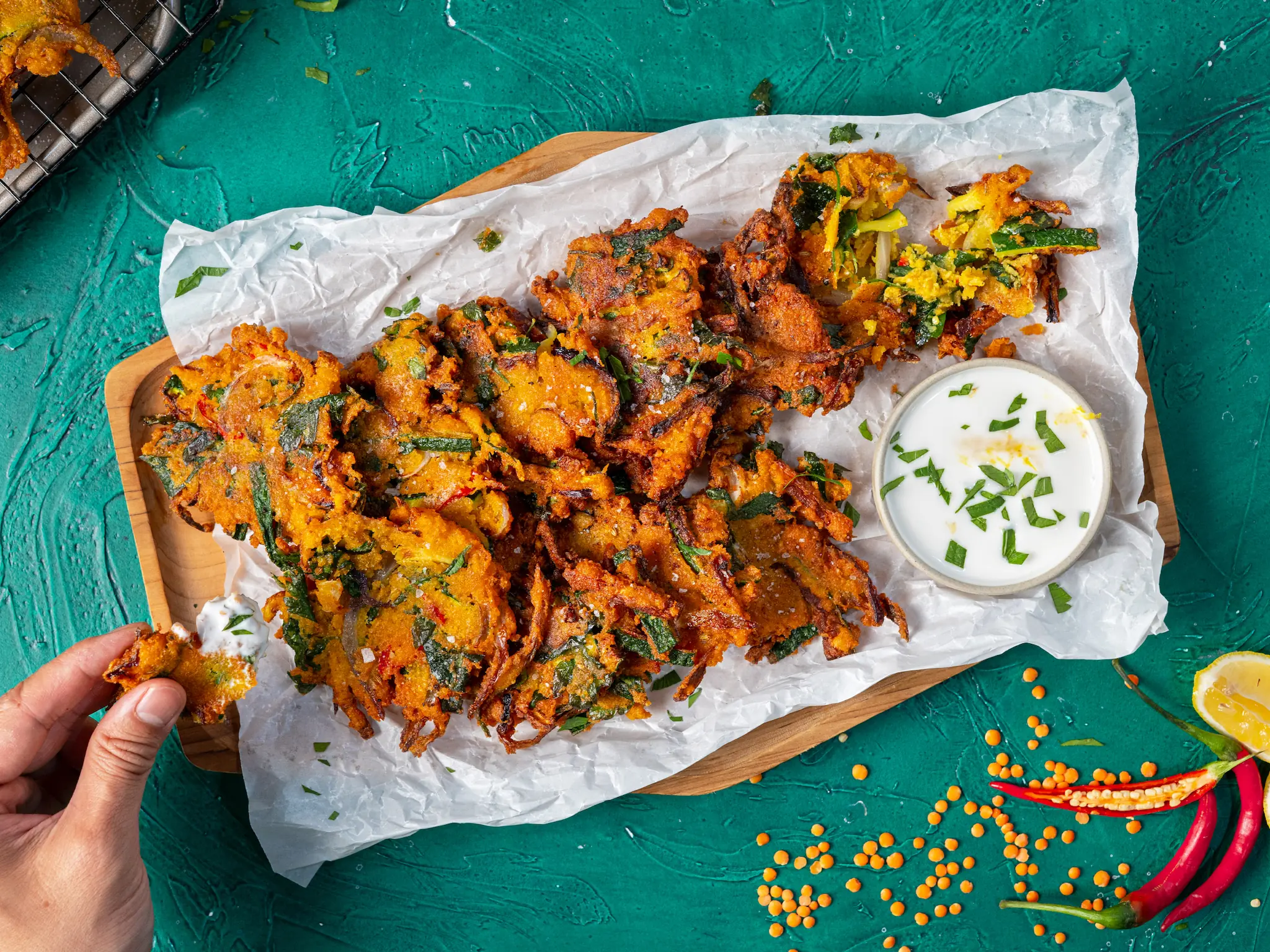 These Vegan Zucchini Fritters are an elevated version of the classic Indian vegetable fritter (Pakora). It utilizes lentils and hand-cut vegetables to give more of a bite where the textures and flavors of the vegetables are more pronounced. If you're looking for a crunchy and savory treat, you don't want to miss out on this dish. It's paired with a delightful sweet yogurt dip that will leave your taste buds craving for more.