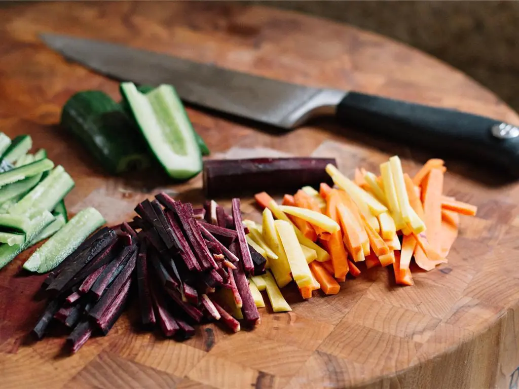 While the rice cooks, slice the Persian Cucumbers (2) in half, scoop out the seeds, then slice into matchsticks. Julienne the Carrots (3).