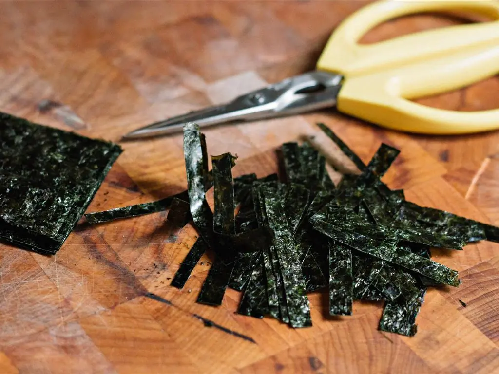 Stack the Nori Sheets (2) and cut into thirds lengthwise. Stack and use kitchen shears to cut into ¼ inch thick strips.
