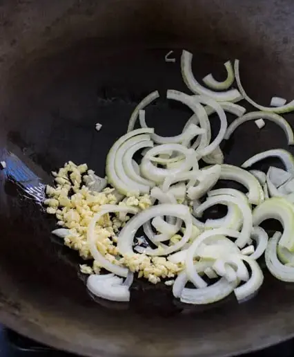 Heat Cooking Oil (2 Tbsp) in a wok over medium-high heat. Add Onion (1) and Garlic (3 cloves) to the wok. Stir-fry for 1 minute to allow the onion sliced to soften.