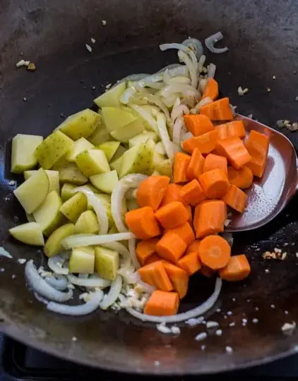 Add Yukon Gold Potatoes (2) and Carrots (2) to the wok. Stir occasionally for 2 minutes.