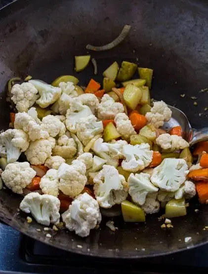 Add Cauliflower Florets (2 cups) to the wok. Stir for 1 more minute.