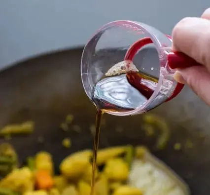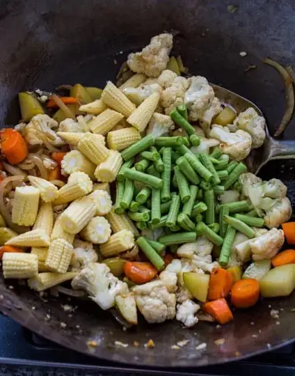 Toss in Green Beans (1 cup) and Baby Corn (1 1/2 cups) to the wok. Pour 2 Tbsp of water into the wok to help steam the vegetables.