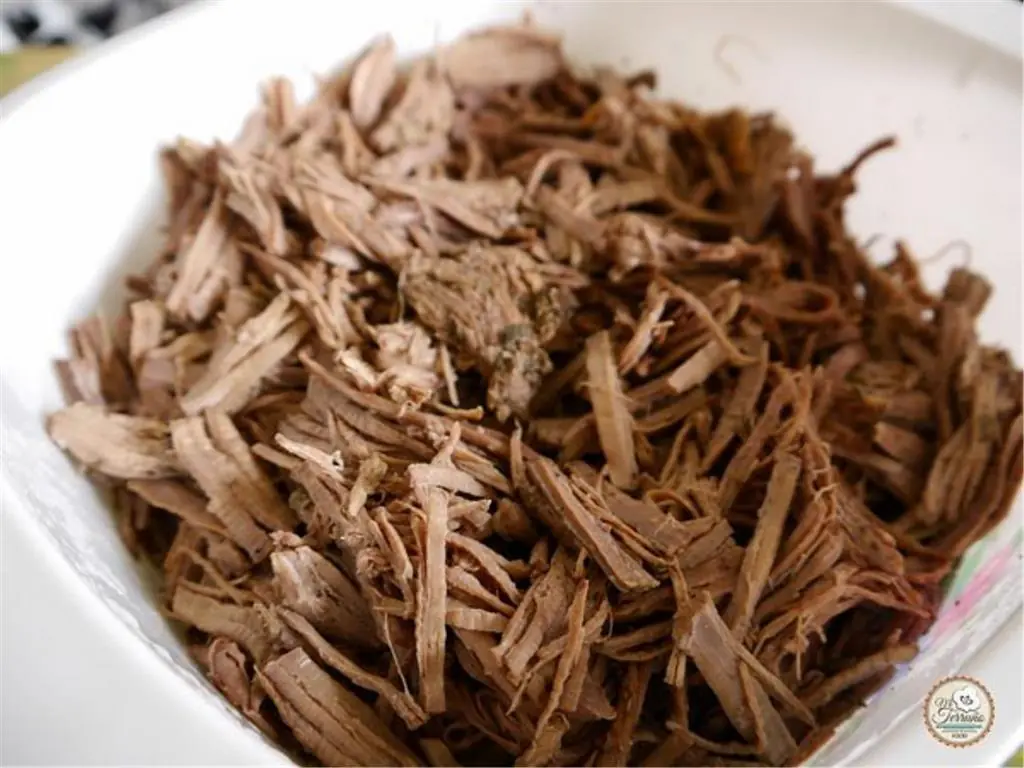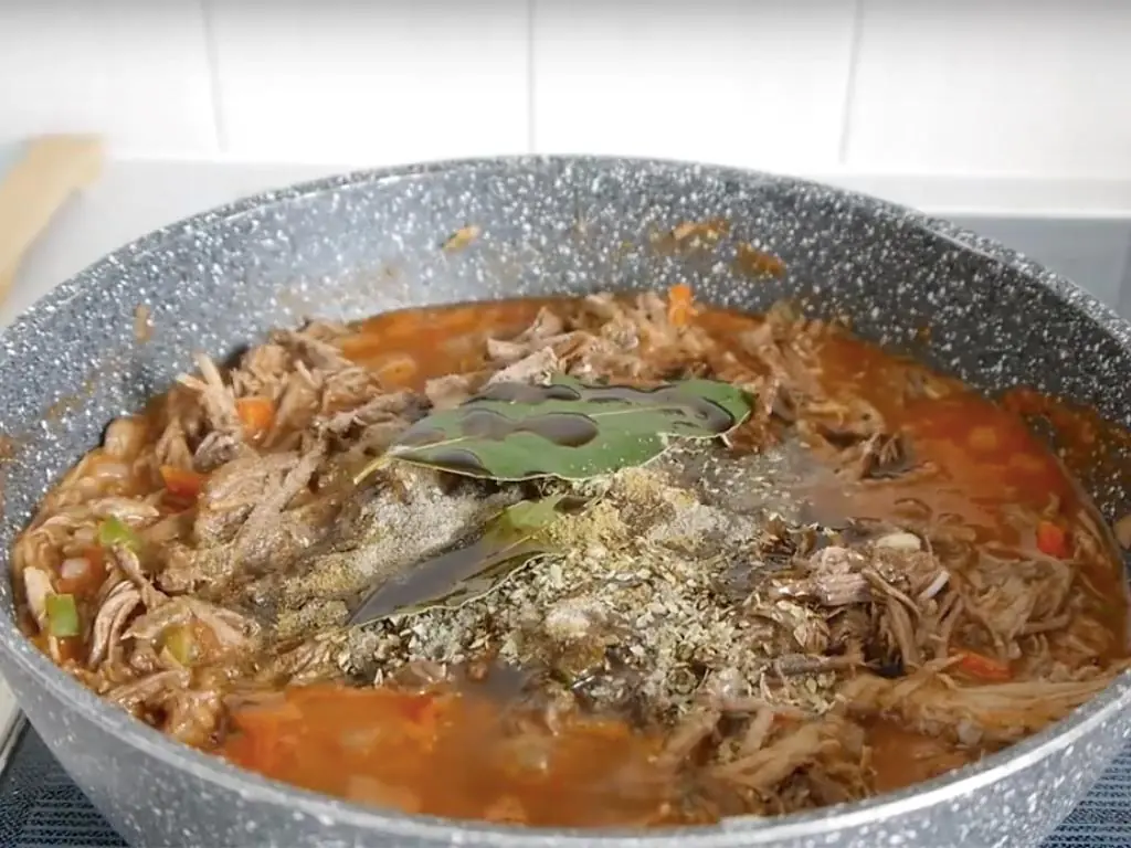 Add the pulled beef, Tomato Passata (2 cups), Dried Oregano (2 Tbsp), Ground Cumin (2 tsp), Ground Black Pepper (1/2 tsp), Simply Organic Garlic Powder (2 tsp), Worcestershire Sauce (2 Tbsp), Water (1 splash), Bay Leaves (2), and Salt (1 tsp).