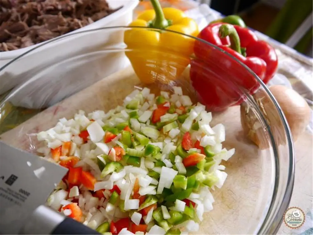 Chop the Onion (1), Green Bell Pepper (1), Red Bell Pepper (1). and Garlic (4). In a hot pan, add the Vegetable Oil (3 Tbsp) and add the chopped vegetables and garlic. Leave to sweat for 5 minutes.