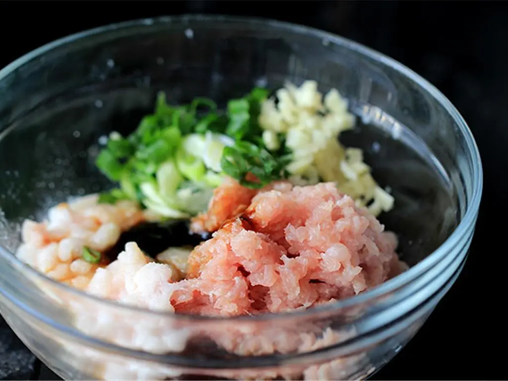 To make the filling, combine the Ground Pork (1 cup), Scallions (2 Tbsp), Fresh Ginger (1 tsp), Eggland's Best Classic Egg (1), Shrimp (1/2 cup), Ground Black Pepper (1/2 tsp), Sesame Oil (1/2 tsp), Oyster Sauce (1 Tbsp) and Salt (to taste).