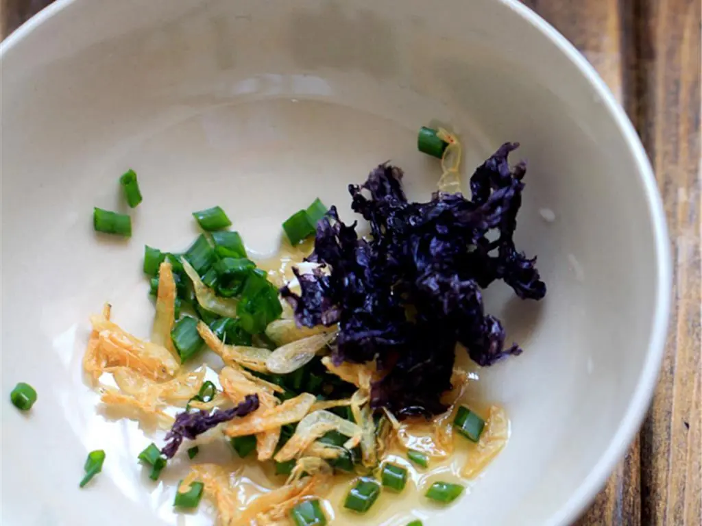 In a serving bowl, mix Dried Shrimp (1 tsp), Sesame Oil (1 tsp), chopped Scallions (to taste), Dried Seaweed (1 piece) and Salt (to taste). Set aside.