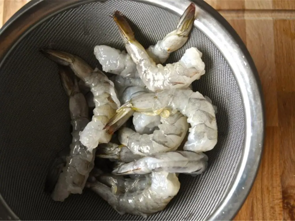 Peel and devein the Medium Shrimp (10). Rinse them and set aside in the refrigerator until you need them.